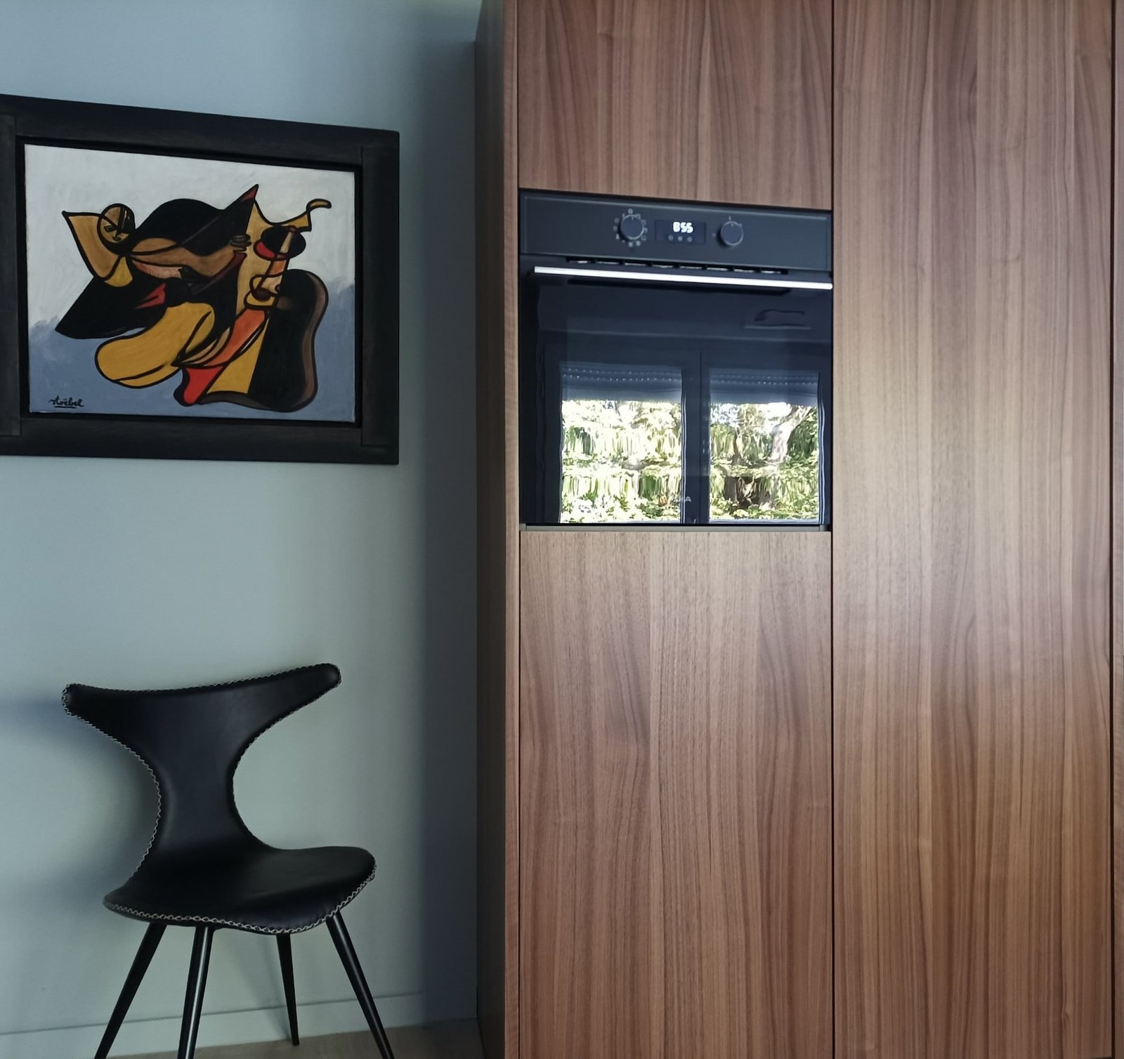 Cuisine Next125 – Façades en plaquage Noyer naturel laque mat – Plan de travail en céramique marbre noir mat – Crédence miroir
